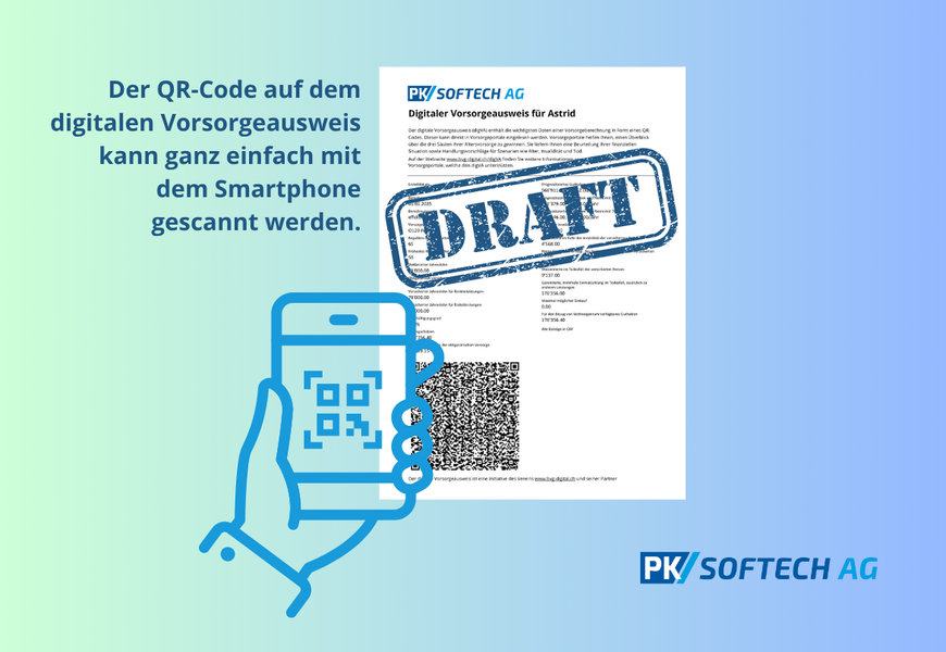 In der ersten Ausbaustufe handelt es sich um einen digitalen Vorsorgeausweis mit integriertem QR-Code, der die wichtigsten Vorsorgedaten enthält und sich nahtlos über kompatible Vorsorgeportale – etwa unsere PK/S.Live Vorsorgeportale – beziehen lässt. Mit dem Smartphone kann der QR-Code unkompliziert erfasst und angezeigt werden. Mit der elektronischen Identität (e-ID), welche der Bund im Q3 2026 in der Wallet-App «swiyu» ausstellt, wird es dann auch möglich sein, den E-Vorsorgeausweis auf dem eignen Smartphone abzulegen und zu teilen.